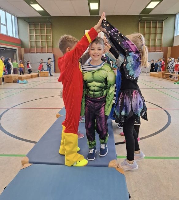 Schon in den ersten beiden Stunden feierten die Klassen intern ihr eigenes Karnevalsprogramm. Einige starteten mit einem gemeinsamen Frühstück, andere spielten lustige Spiele oder bastelten farbenfrohe Dekorationen. Zudem gab es eine kleine Patenaktion: Die Erstklässlerinnen und Erstklässler trafen sich mit ihren Paten aus der vierten Klasse zu einem Lesespaziergang zum Thema Karneval und lasen den Großen erste Texte vor. Anschließend folgten gemeinsame Bastelaktionen mit den Paten. In der dritten und vierten Stunde kamen schließlich alle Klassen in der Turnhalle zusammen, um gemeinsam weiterzufeiern. Dort wurde getanzt, gelacht und die vielen kreativen Kostüme stolz präsentiert. Zu gemeinsamen Liedern wie dem „Gute-Laune-Lied“ entstand schnell eine ausgelassene Stimmung. Auch die Tanzvorführung einiger Kinder zum Lied „Prinzessin“ sorgte für viel Applaus und Begeisterung. Zum Abschluss tanzte die gesamte Schule eine fröhliche Polonaise durch die Halle – ein traditioneller Tanz mit einer festen Abfolge, der den bunten Karnevalsvormittag stimmungsvoll abrundete.