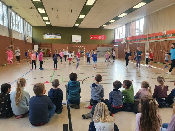Am 11. November nahmen unsere Drittklässler am Skipping Hearts Projekt der Deutschen Herzstiftung teil. In nur zwei Schulstunden übten die Kinder aus der Klasse 3a und 3b zunächst die Grundsprünge des Seilspringens. Anschließend erarbeiteten sie gemeinsam eine kleine Choreografie, die sie mit viel Freude und Einsatz einstudierten.